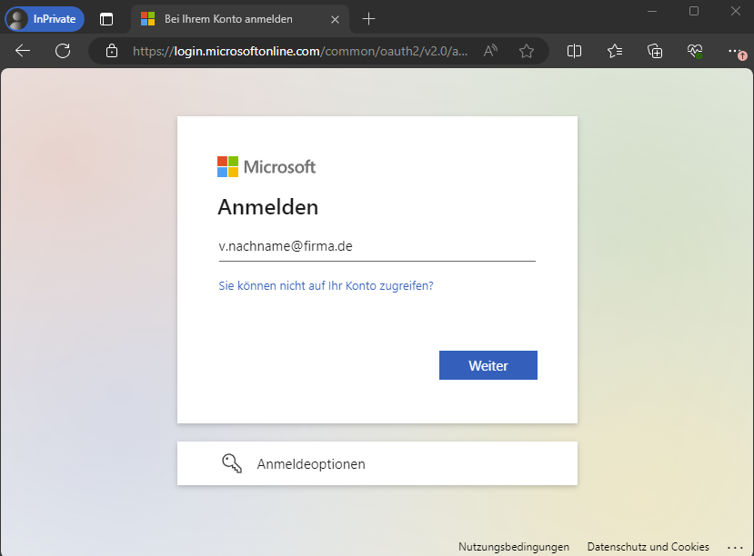 2.) Geben Sie Ihre E-Mail Adresse (Benutzername) ein und klicken Sie auf "Weiter"