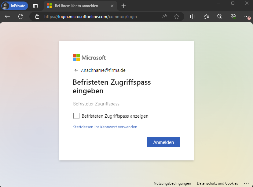 3.) Geben Sie den "Befristeten Zugriffspass" ein und klicken Sie auf "Anmelden"