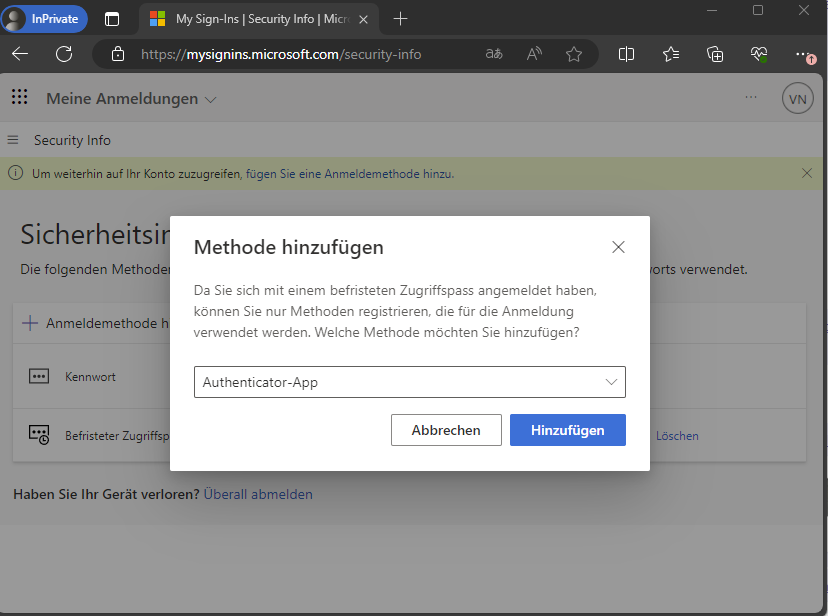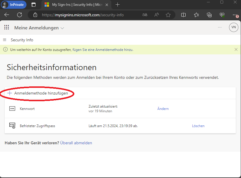 4.) Sie befinden sich nach erfolgreichem Login in den Einstellungen der "Sicherheitsinformationen" - wählen Sie "Anmeldemethode hinzufügen"