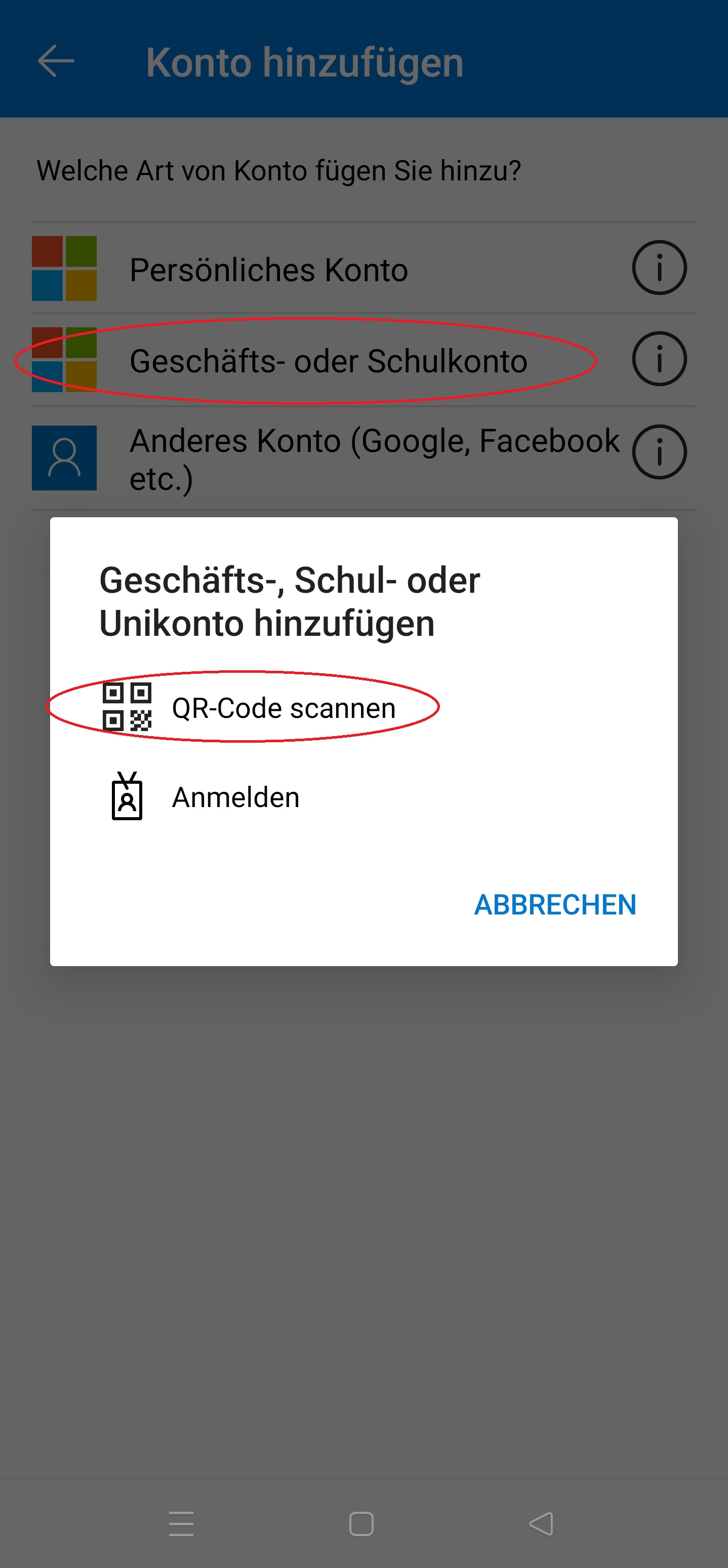 7.) Öffnen Sie die App auf Ihrem Smartphone und fügen Sie ein neues "Geschäfts-, Schul- oder Unikonto" hinzu - wählen Sie die Option "QR-Code scannen"