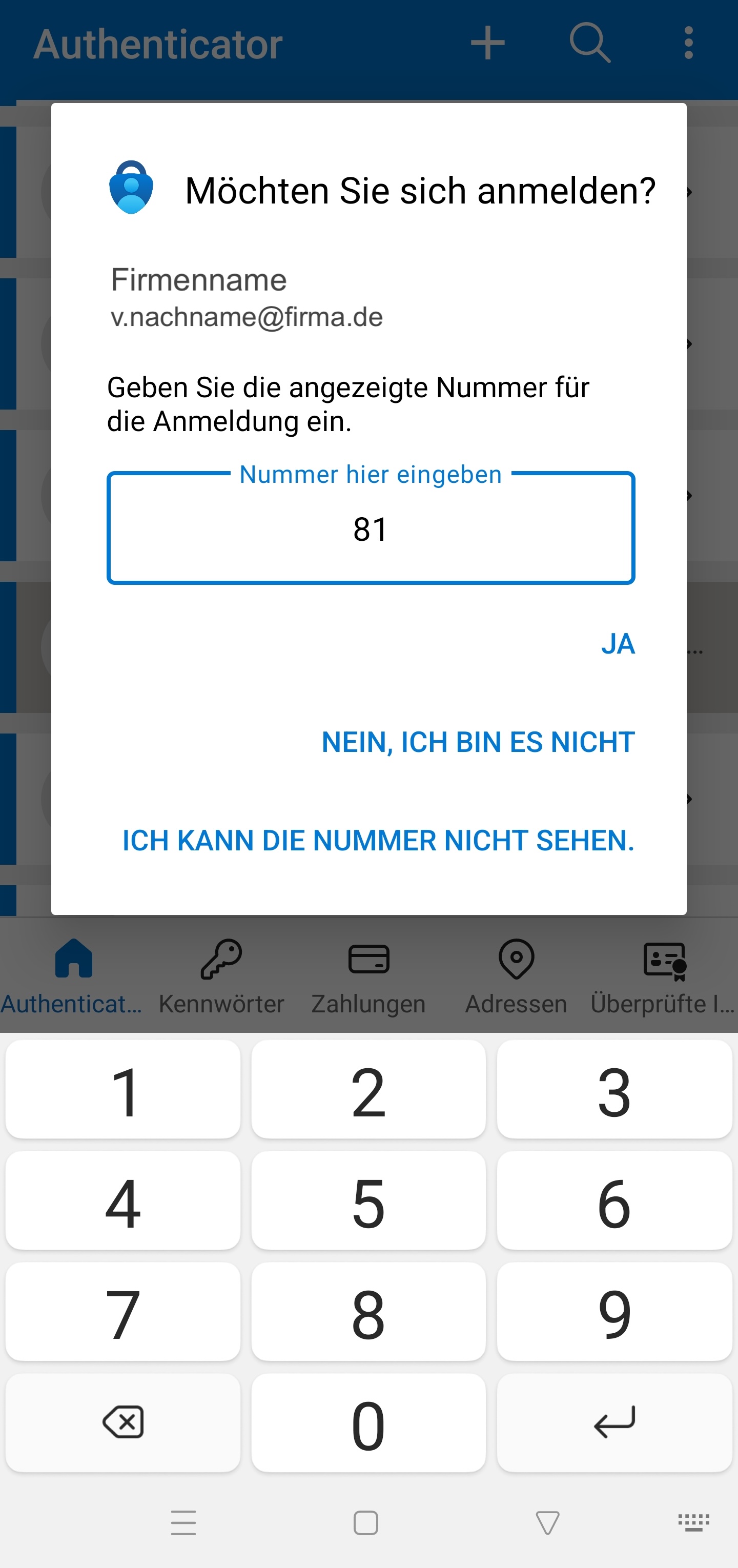 9.) Nach erfolgreichem einscannen wird über "Weiter" eine Test-Anmeldebenachrichtigung versendet - gleichen Sie die Nummer auf dem Bildschirm mit der Authenticator-App ab
