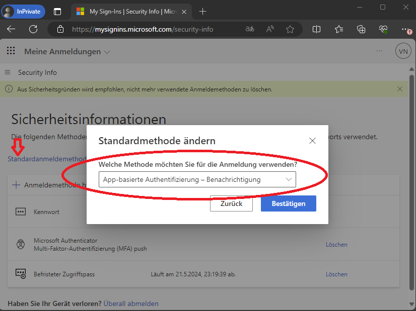 Wählen Sie hier "App-basierte Authentifizierung - Benachrichtigung" aus und bestätigen Sie.